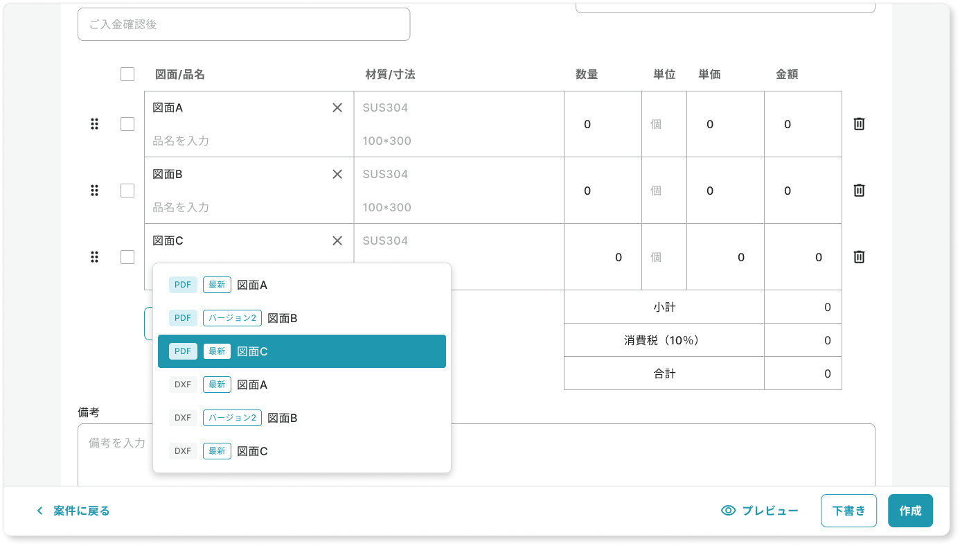 見積書を作成する際には、案件に登録されている図面のファイル名から品名を取得。入力の手間を削減します。