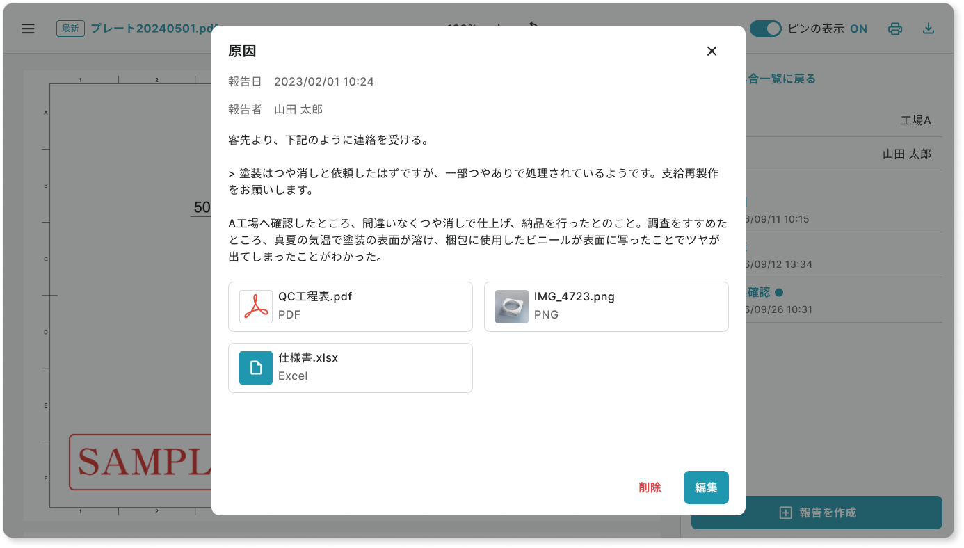 図面の不具合箇所にピンを刺し、不具合種別・発生元(不具合を起こしてしまった会社)を登録できます。その後、報告という形で詳細を記録できます。